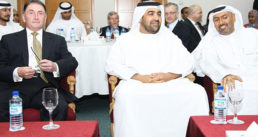 [Left to right: Omar Khodr (Presenter), Hugh Hall (Chief Operating Officer), Sir Jim McDonald (Vice Chancellor), Nabil Alyousuf (Chairman-Al Jal Capital), Samir Thakran (Presenter), Catherine Demangeot (Sr. Lecturer), Ron Bradfield (Associate Dean)]