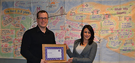 Over 2012/3, academics from Strategy and Organisation worked with an organisation in Govan called C-Change Scotland. They are a supported living organisation that works with and for adults with learning difficulties and/or mental health issues. The aim was to develop ideas around "inclusive strategy making", where ideals of accessibility – through inclusive design theory – were applied to the strategy making process. The shared ambition was to include all hierarchical levels and the supported people C-Change work for in the strategy making process. This was to allow the gathering of strategic ideas from as broad a range of talents and expertise as possible in the organisation, whilst building ownership and commitment to implementation for the outputs agreed. From the baseline process of "Making Strategy", as taught on the MBA module of the same name, the collaborative partnership redesigned methods to maximise accessibility without compromising functionality e.g. a graphic artist created multi-modal strategy montages live, in parallel to decision explorer maps. After successfully completing the research, the process redesign work was submitted for consideration to the Scottish Social Services Council's Care Accolade Awards, which recognise achievement, partnership working and innovation in the Scottish social service sector. From over 150 entries, the SBS-C-Change collaboration was recognised amongst 25 finalists in an awards ceremony in Perth, reaching the top 3 in the "Innovation and Redesign" category. The inclusive strategy work followed on from an Interface initiated Innovation Voucher knowledge exchange project the previous year, and has led to a number of further outcomes (such as a co-authored journal submission, guest MBA lectures and PhD student data collection).